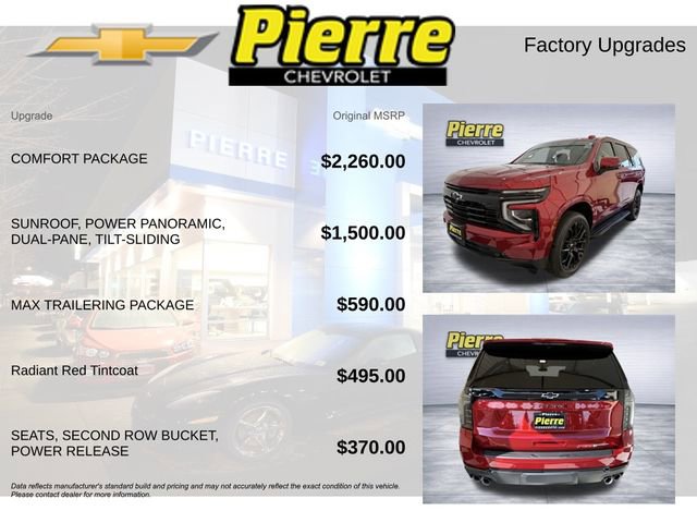This Tahoe RST includes the Comfort Package, Sunroof, Power Panoramic, Dual-Pane, Tilt-Sliding, and Max Trailering Package.
