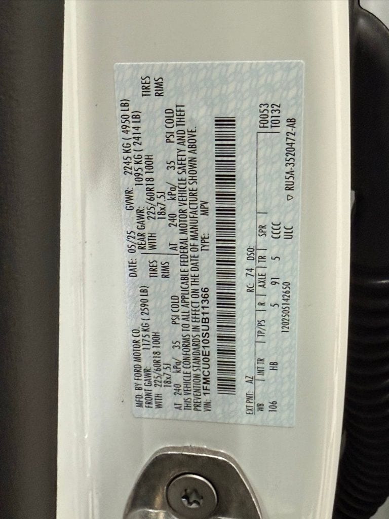 2025 Ford Escape Plug-In Hybrid, Star White Metallic Tri-Coat, 18" Machined Magnetic Alum Wh, 225/60R18 100H A/S BSW Tires, Panoramic Vista Roof, Auto Hold, Adaptive Cruise Control, BLIS W/Cross-Traffic Alert, Connected Nav: 1 Yr Incl, FordPass Connect, Lane-Keeping System/Alert, Mobile Power Cord, Pedestrian Alert Sounder, Rear Parking Sensors, Refresh95, Remote Start System, SiriusXM W/360L- NA AK&HI, SYNC4 W/EVR & 13.2" Scrn