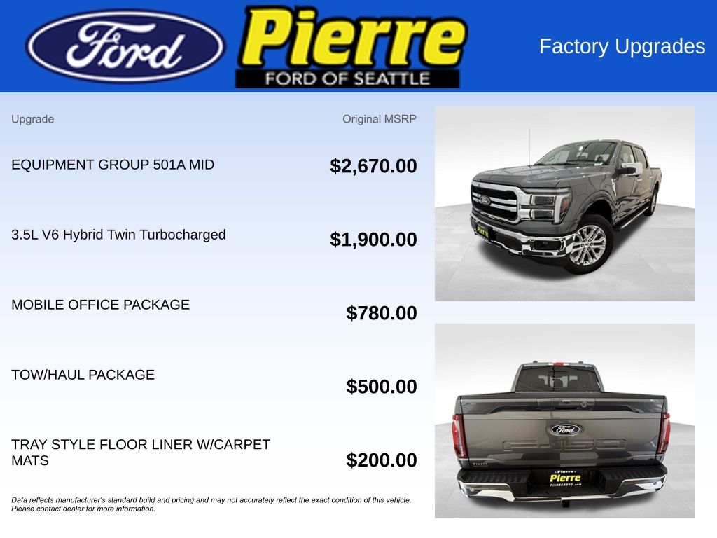 At Bill Pierre Ford, we service not only the Seattle area Ford customer needs, but also the entire state of Washington and beyond. Our customers come from Seattle, Bremerton, Bellevue, Everett, Wenatchee, Arlington, Burlington, Marysville, Lynnwood, Tacoma, and more. 3.5L PowerBoost Full-Hybrid V6 10-Speed Automatic Gray All vehicles are one of each. A dealer documentary service fee of up to $200 may be added to the sale price or capitalized cost. All financing is subject to credit approval. Prices exclude tax, title, and license and are valid for Washington residents only. All transactions are negotiable including price, trade allowance, interest rate (of which the dealer may retain a portion), term, and documentary service fee. Any agreement is subject to execution of contract documents. Every reasonable effort is made to ensure the accuracy of this data. Please verify any information in question with a dealership sales representative. Expires (date) **FACTORY REBATE(S) Purchaser may not qualify for all rebates. Please contact sales department for details. Price includes: $1000 - Final Days Mega Bonus Cash. Exp. 01/02/2026 $2000 - Retail Customer Cash. Exp. 01/05/2026