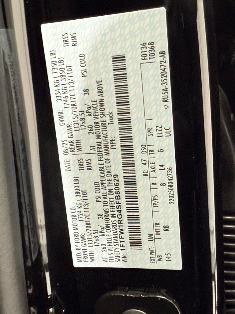 17" Cast Aluminum Wheels, LT315/70R17 Black Sidewall All-Terrain Tires, 4.10 Electronic Locking Rear Axle, 7,350 lb Gross Vehicle Weight Rating Package, Graphics Delete, 360-Degree Camera, B&O Unleashed Sound System with 14 Speakers, Bed Utility Package, FordPass Connect with 5G Wi-Fi Hotspot and Telematics Modem, FOX Live Valve Shocks, Mobile Office Package, Pro Trailer Backup Assist, Pro Trailer Hitch Assist, Reverse Sensing System and Rear View Camera, Skid Plates, SYNC 4 with Enhanced Voice Recognition and 12" Screen, Terrain Management System, Trail Control.