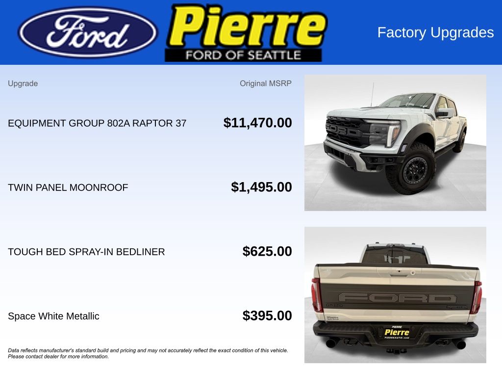 At Bill Pierre Ford, we service not only the Seattle area Ford customer needs, but also the entire state of Washington and beyond. Our customers come from Seattle, Bremerton, Bellevue, Everett, Wenatchee, Arlington, Burlington, Marysville, Lynnwood, Tacoma, and more. 3.5L V6 EcoBoost 10-Speed Automatic White Metallic All vehicles are one of each. A dealer documentary service fee of up to $200 may be added to the sale price or capitalized cost. All financing is subject to credit approval. Prices exclude tax, title, and license and are valid for Washington residents only. All transactions are negotiable including price, trade allowance, interest rate (of which the dealer may retain a portion), term, and documentary service fee. Any agreement is subject to execution of contract documents. Every reasonable effort is made to ensure the accuracy of this data. Please verify any information in question with a dealership sales representative. Expires (date) **FACTORY REBATE(S) Purchaser may not qualify for all rebates. Please contact sales department for details.