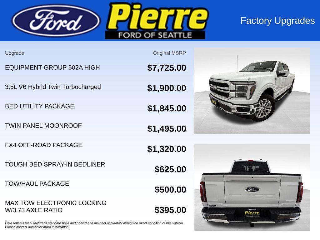 At Bill Pierre Ford, we service not only the Seattle area Ford customer needs, but also the entire state of Washington and beyond. Our customers come from Seattle, Bremerton, Bellevue, Everett, Wenatchee, Arlington, Burlington, Marysville, Lynnwood, Tacoma, and more. 3.5L PowerBoost Full-Hybrid V6 10-Speed Automatic Oxford White All vehicles are one of each. A dealer documentary service fee of up to $200 may be added to the sale price or capitalized cost. All financing is subject to credit approval. Prices exclude tax, title, and license and are valid for Washington residents only. All transactions are negotiable including price, trade allowance, interest rate (of which the dealer may retain a portion), term, and documentary service fee. Any agreement is subject to execution of contract documents. Every reasonable effort is made to ensure the accuracy of this data. Please verify any information in question with a dealership sales representative. Expires (date) **FACTORY REBATE(S) Purchaser may not qualify for all rebates. Please contact sales department for details. Price includes: $1000 - Final Days Mega Bonus Cash. Exp. 01/02/2026 $2000 - Retail Customer Cash. Exp. 01/05/2026