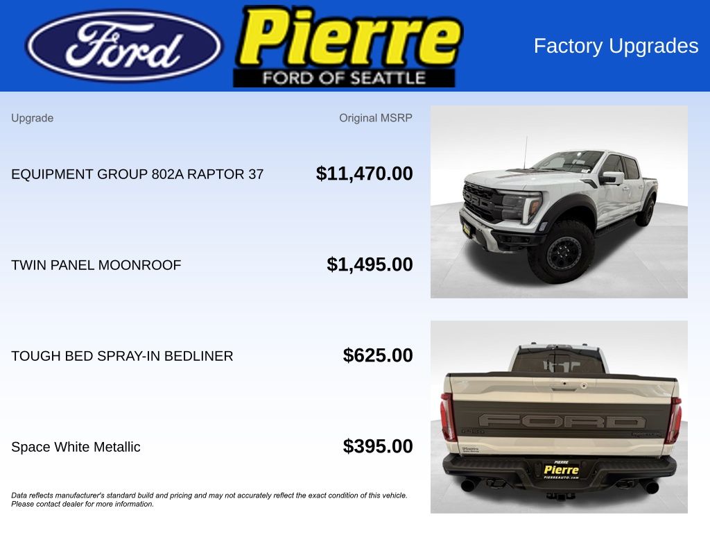 At Bill Pierre Ford, we service not only the Seattle area Ford customer needs, but also the entire state of Washington and beyond. Our customers come from Seattle, Bremerton, Bellevue, Everett, Wenatchee, Arlington, Burlington, Marysville, Lynnwood, Tacoma, and more. 3.5L V6 EcoBoost 10-Speed Automatic White Metallic All vehicles are one of each. A dealer documentary service fee of up to $200 may be added to the sale price or capitalized cost. All financing is subject to credit approval. Prices exclude tax, title, and license and are valid for Washington residents only. All transactions are negotiable including price, trade allowance, interest rate (of which the dealer may retain a portion), term, and documentary service fee. Any agreement is subject to execution of contract documents. Every reasonable effort is made to ensure the accuracy of this data. Please verify any information in question with a dealership sales representative. Expires (date) **FACTORY REBATE(S) Purchaser may not qualify for all rebates. Please contact sales department for details.