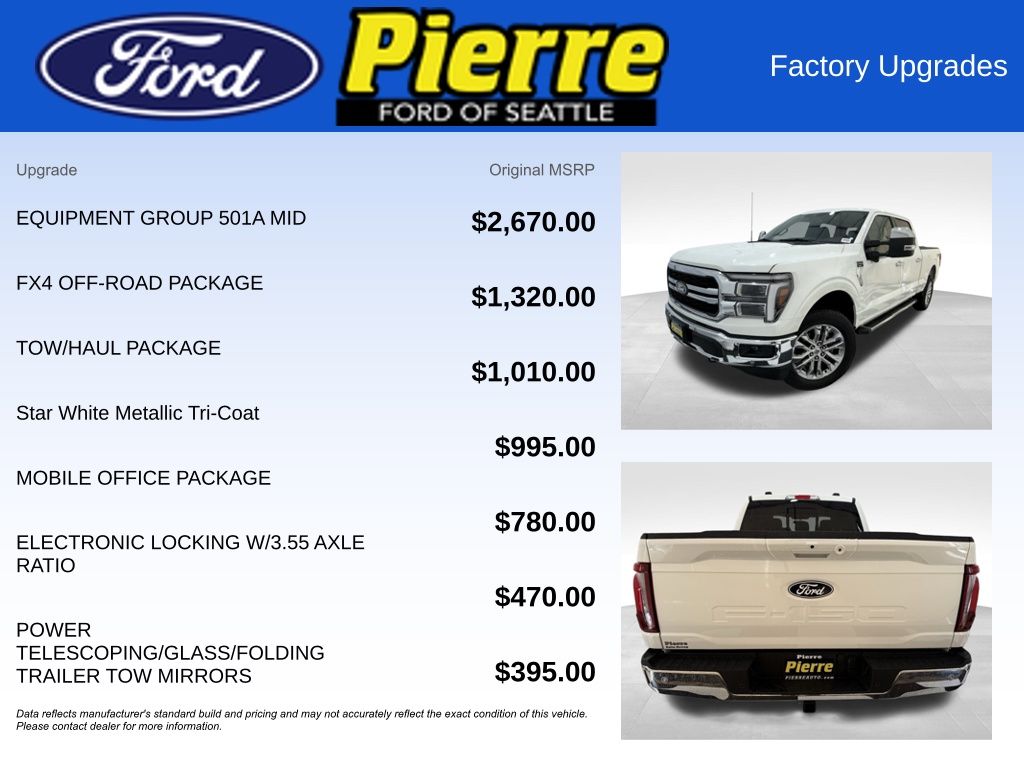 At Bill Pierre Ford, we service not only the Seattle area Ford customer needs, but also the entire state of Washington and beyond. Our customers come from Seattle, Bremerton, Bellevue, Everett, Wenatchee, Arlington, Burlington, Marysville, Lynnwood, Tacoma, and more. 3.5L V6 EcoBoost 10-Speed Automatic White Metallic All vehicles are one of each. A dealer documentary service fee of up to $200 may be added to the sale price or capitalized cost. All financing is subject to credit approval. Prices exclude tax, title, and license and are valid for Washington residents only. All transactions are negotiable including price, trade allowance, interest rate (of which the dealer may retain a portion), term, and documentary service fee. Any agreement is subject to execution of contract documents. Every reasonable effort is made to ensure the accuracy of this data. Please verify any information in question with a dealership sales representative. Expires (date) **FACTORY REBATE(S) Purchaser may not qualify for all rebates. Please contact sales department for details. Price includes: $1000 - Final Days Mega Bonus Cash. Exp. 01/02/2026 $2000 - Retail Customer Cash. Exp. 01/05/2026