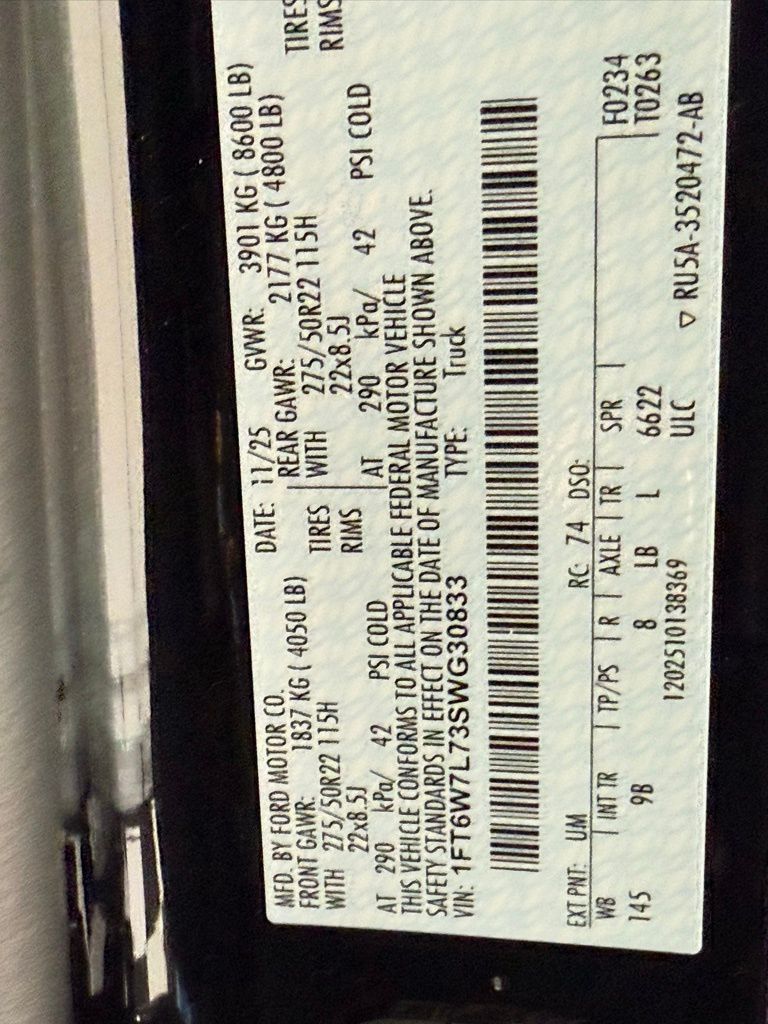 - Front tires: 275/50SR22.0