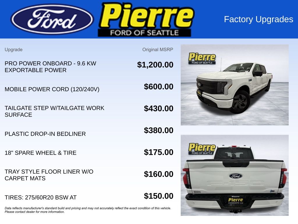 At Bill Pierre Ford, we service not only the Seattle area Ford customer needs, but also the entire state of Washington and beyond. Our customers come from Seattle, Bremerton, Bellevue, Everett, Wenatchee, Arlington, Burlington, Marysville, Lynnwood, Tacoma, and more. Electric Motor Single-Speed Automatic Oxford White All vehicles are one of each. A dealer documentary service fee of up to $200 may be added to the sale price or capitalized cost. All financing is subject to credit approval. Prices exclude tax, title, and license and are valid for Washington residents only. All transactions are negotiable including price, trade allowance, interest rate (of which the dealer may retain a portion), term, and documentary service fee. Any agreement is subject to execution of contract documents. Every reasonable effort is made to ensure the accuracy of this data. Please verify any information in question with a dealership sales representative. Expires (date) **FACTORY REBATE(S) Purchaser may not qualify for all rebates. Please contact sales department for details. Price includes: $1000 - Retail Bonus Cash. Exp. 04/30/2026 $1000 - Retail Bonus Cash. Exp. 04/30/2026 $2000 - EV Public Charging Credit(FPP Alt.). Exp. 07/06/2026 $5000 - Retail Customer Cash. Exp. 04/30/2026