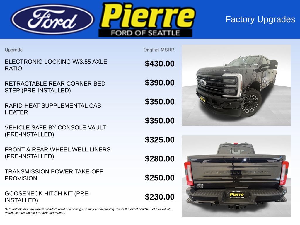 Preferred Equipment Package 713A, 6.7 High Output Power Stroke, 10-Speed Automatic TorqShift , 3.55 Electronic-Locking Axle, Gooseneck Hitch Kit, All Weather Mats Without Carpet Mat, FX4 Off-Road Package (Skid Plates), Power Running Boards No Charge, 12000# GVWR Package, Vehicle Safe by Console Vault, Rapid Heat Supplemental Heater, Engine Block Heater, Pro Power Onboard - 2KW, 5th Wheel Hitch Prep Package, Roof Clearance Lights, Jack, Wheel Well Liners Front & Rear, Transmission Power Take-Off Provision, Moonroof Power-Twin Panel, Upfitter Switches, Heavy Service Front Suspension, Tough Bed Spray-In Bedliner, Retractable Rear Bed Step, Retractable Bed Side-Step, Max Recline Driver Passenger Seat.