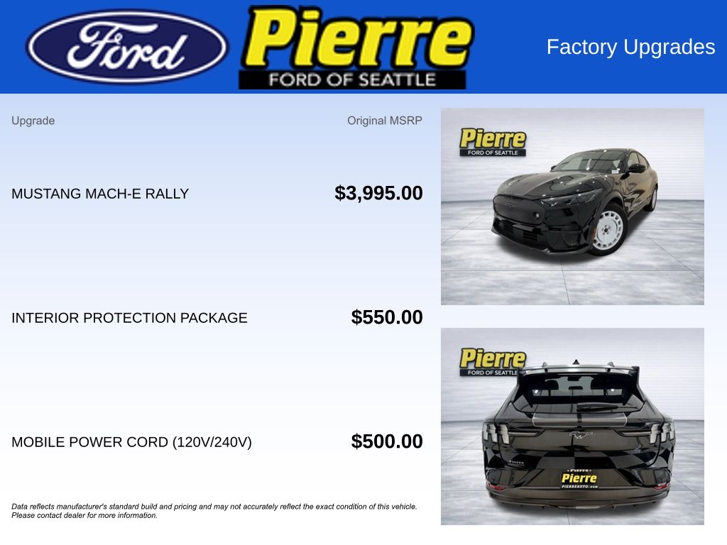 2025 Ford Mustang Mach-E GT, 35/55R19 105V tires, Mustang Mach-E Rally: 19-inch white wheels with black graphic, MagneRide damping system, Mach-E GT performance upgrade, unique rear spoiler, hood decklid and side graphic, clear paint protective film, BlueCruise equipment (1-year plan), Connect package (1 year included), mobile power cord and fast charge adapter, interior protection package: cargo floor liner, floor liners front/rear (no carpet mats), exterior bumper protector.