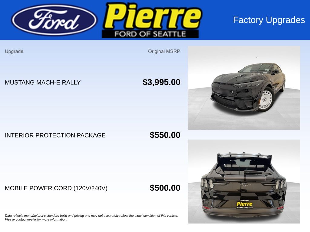 235/55R19 105V Tire, Mustang Mach-E Rally, 19" White Wheels with Black Graphic, MagneRide Damping System 2, Mustang Mach-E GT Performance Upgrade, Unique Rear Spoiler, Hood Decklid and Side Graphic, Clear Paint Protective Film, BlueCruise Equipment (1-Year Plan), Connect Package (1-Year Included), Mobile Power Cord and Fast Charge Adapter, Interior Protection Package (Cargo Floor Liner, Floor Liners Front/Rear: No Carpet Mats).