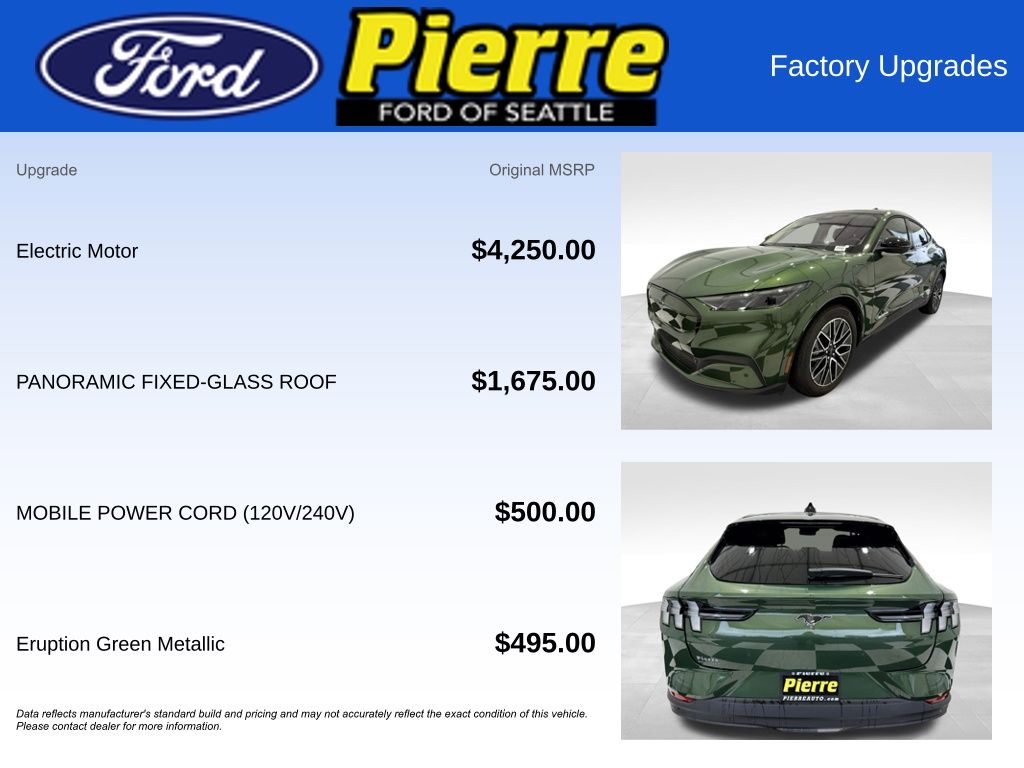 At Bill Pierre Ford, we service not only the Seattle area Ford customer needs, but also the entire state of Washington and beyond. Our customers come from Seattle, Bremerton, Bellevue, Everett, Wenatchee, Arlington, Burlington, Marysville, Lynnwood, Tacoma, and more. Dual Electric Motor Single-Speed Automatic Green Metallic All vehicles are one of each. A dealer documentary service fee of up to $200 may be added to the sale price or capitalized cost. All financing is subject to credit approval. Prices exclude tax, title, and license and are valid for Washington residents only. All transactions are negotiable including price, trade allowance, interest rate (of which the dealer may retain a portion), term, and documentary service fee. Any agreement is subject to execution of contract documents. Every reasonable effort is made to ensure the accuracy of this data. Please verify any information in question with a dealership sales representative. Expires (date) **FACTORY REBATE(S) Purchaser may not qualify for all rebates. Please contact sales department for details.