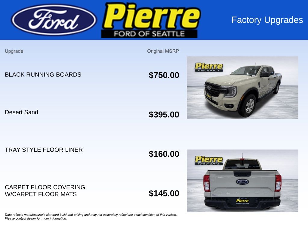 At Bill Pierre Ford, we service not only the Seattle area Ford customer needs, but also the entire state of Washington and beyond. Our customers come from Seattle, Bremerton, Bellevue, Everett, Wenatchee, Arlington, Burlington, Marysville, Lynnwood, Tacoma, and more. EcoBoost 2.3L I4 GTDi DOHC Turbocharged VCT 10-Speed Automatic Desert Sand All vehicles are one of each. A dealer documentary service fee of up to $200 may be added to the sale price or capitalized cost. All financing is subject to credit approval. Prices exclude tax, title, and license and are valid for Washington residents only. All transactions are negotiable including price, trade allowance, interest rate (of which the dealer may retain a portion), term, and documentary service fee. Any agreement is subject to execution of contract documents. Every reasonable effort is made to ensure the accuracy of this data. Please verify any information in question with a dealership sales representative. Expires (date) **FACTORY REBATE(S) Purchaser may not qualify for all rebates. Please contact sales department for details. Price includes: $1000 - Truck Month Bonus Customer Cash. Exp. 03/31/2026 $2000 - Bonus Customer Cash. Exp. 03/31/2026