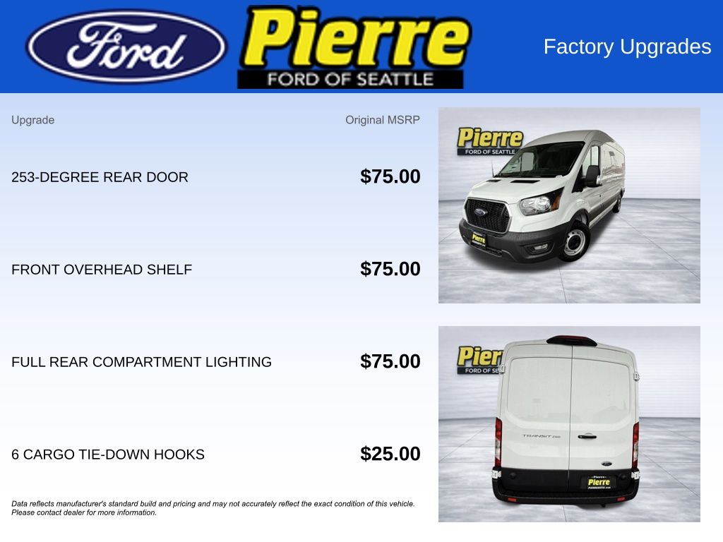 Preferred Equipment Package 101A, 3.73 Non-Limited Slip Axle, Rear Compartment Lighting, Tie Down Cargo Hooks, 253 Degree Opening, 9150# GVWR Package, 2-Way Driver/Passenger Palazzo Cloth, Reverse Sensing System, Short-Arm Power Heated Mirrors, Front Fog Lamps, Electronic Air Temperature Control, SYNC 4 AM/FM Bluetooth, 360-Degree Camera, Front Overhead Shelf, Large Center Console, Vinyl Mats Floor Covering, Load Area Protection Package, Vinyl Front/Rear Floor Covering, E-85 Flex Fuel Capable.