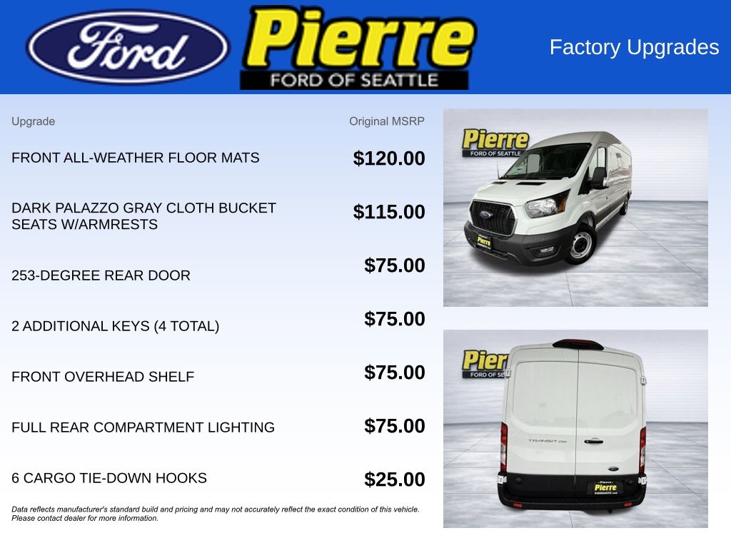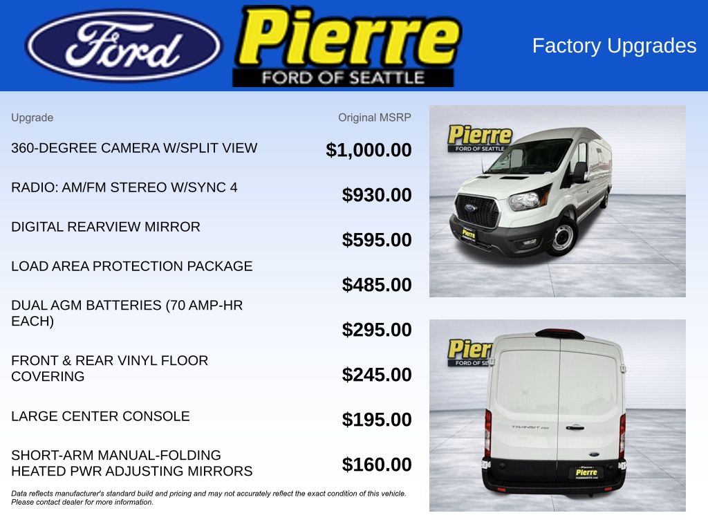 Preferred Equipment Package 101A, 3.73 non-limited slip axle, rear compartment lighting, tie down cargo hooks, 253 degree opening, 9150# GVWR package, 2-way driver/passenger Palazzo cloth, reverse sensing system, short-arm power heated mirrors, front fog lamps, electronic air temperature control, SYNC 4 AM/FM Bluetooth, 360-degree camera, dual batteries (70 amp-hour), front overhead shelf, large center console, 2 additional keys, vinyl mats floor covering, virtual rearview mirror, load area protection package, vinyl front/rear floor covering.
