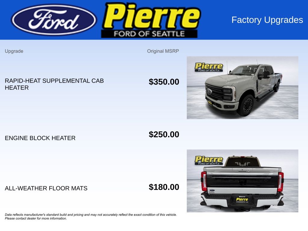 At Bill Pierre Ford, we service not only the Seattle area Ford customer needs, but also the entire state of Washington and beyond. Our customers come from Seattle, Bremerton, Bellevue, Everett, Wenatchee, Arlington, Burlington, Marysville, Lynnwood, Tacoma, and more. 6.7L High Output Power Stroke V8 Diesel 10-Speed Automatic Avalanche All vehicles are one of each. A dealer documentary service fee of up to $200 may be added to the sale price or capitalized cost. All financing is subject to credit approval. Prices exclude tax, title, and license and are valid for Washington residents only. All transactions are negotiable including price, trade allowance, interest rate (of which the dealer may retain a portion), term, and documentary service fee. Any agreement is subject to execution of contract documents. Every reasonable effort is made to ensure the accuracy of this data. Please verify any information in question with a dealership sales representative. Expires (date) **FACTORY REBATE(S) Purchaser may not qualify for all rebates. Please contact sales department for details.