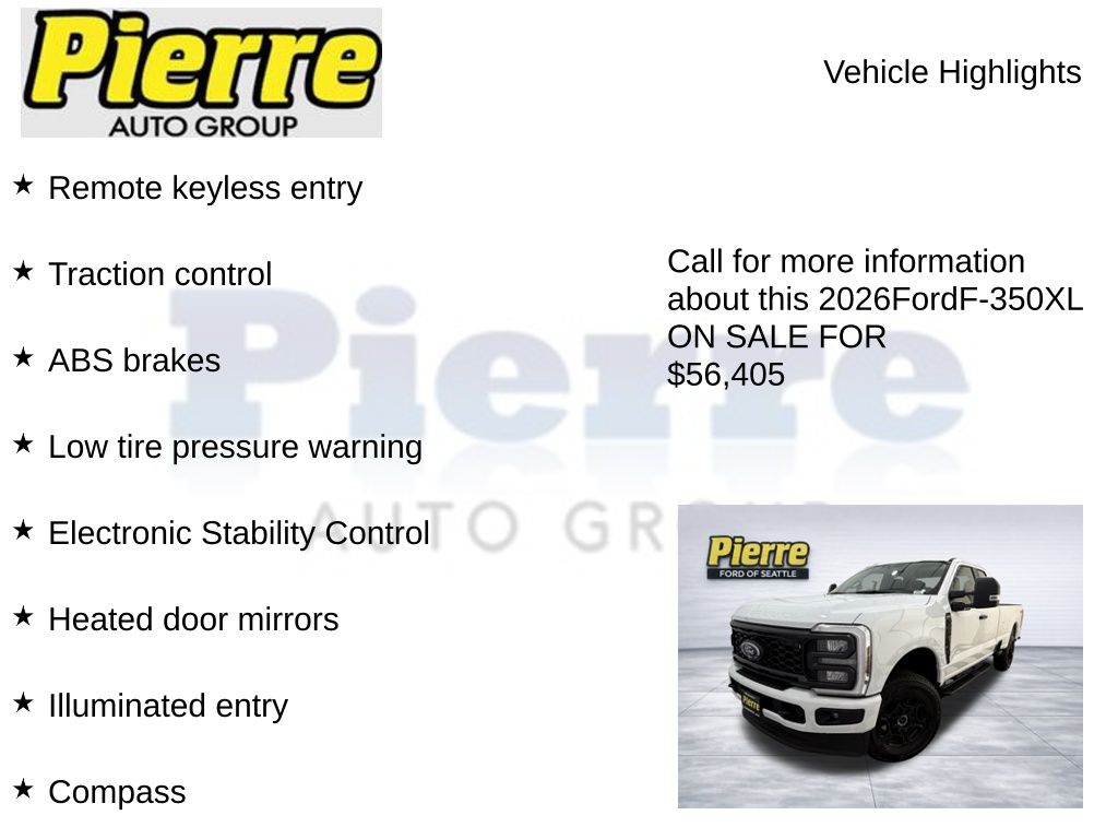 At Bill Pierre Ford, we service not only the Seattle area Ford customer needs, but also the entire state of Washington and beyond. Our customers come from Seattle, Bremerton, Bellevue, Everett, Wenatchee, Arlington, Burlington, Marysville, Lynnwood, Tacoma, and more. 7.3L V8 PFI SOHC 16V Federal 405hp 10-Speed Automatic Oxford White All vehicles are one of each. A dealer documentary service fee of up to $200 may be added to the sale price or capitalized cost. All financing is subject to credit approval. Prices exclude tax, title, and license and are valid for Washington residents only. All transactions are negotiable including price, trade allowance, interest rate (of which the dealer may retain a portion), term, and documentary service fee. Any agreement is subject to execution of contract documents. Every reasonable effort is made to ensure the accuracy of this data. Please verify any information in question with a dealership sales representative. Expires (date) **FACTORY REBATE(S) Purchaser may not qualify for all rebates. Please contact sales department for details. Price includes: $3500 - Retail Customer Cash. Exp. 03/31/2026 $500 - Final Days Retail Customer Cash. Exp. 03/31/2026