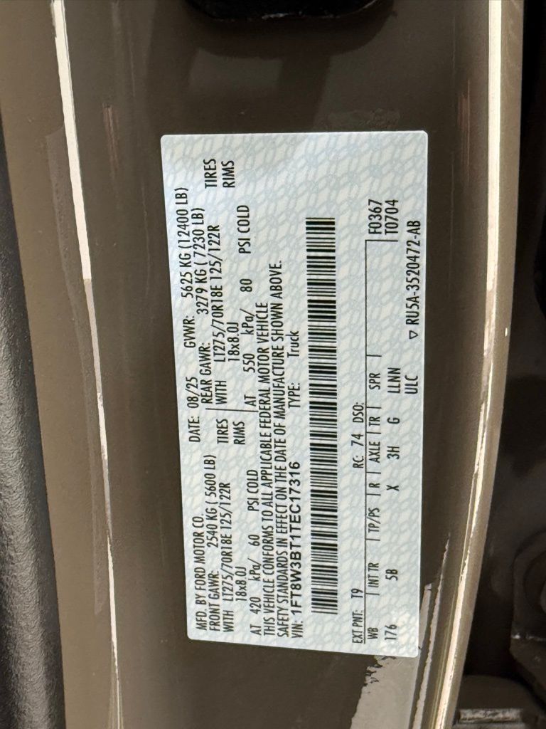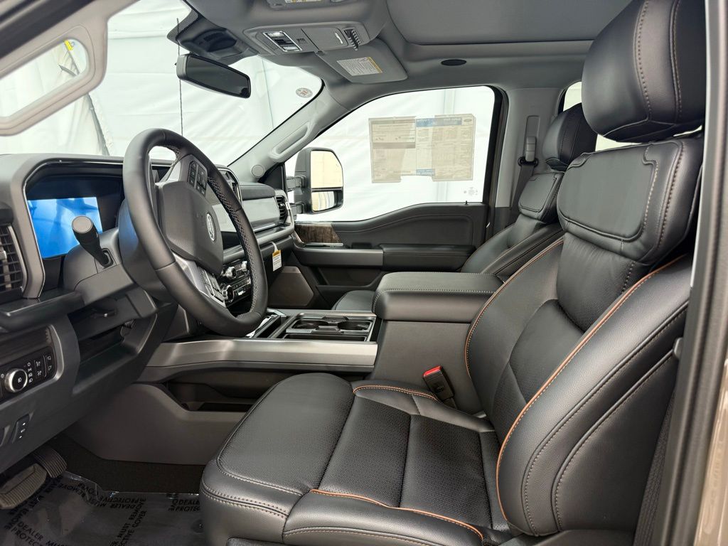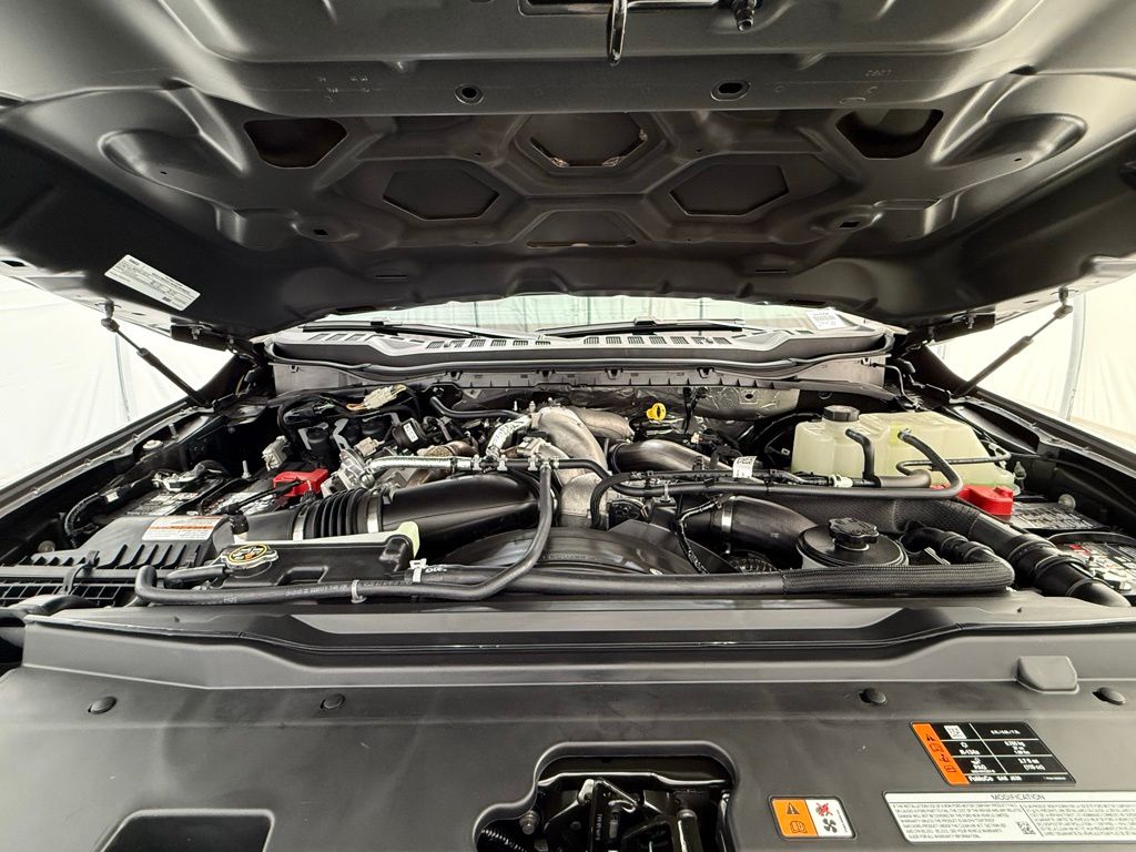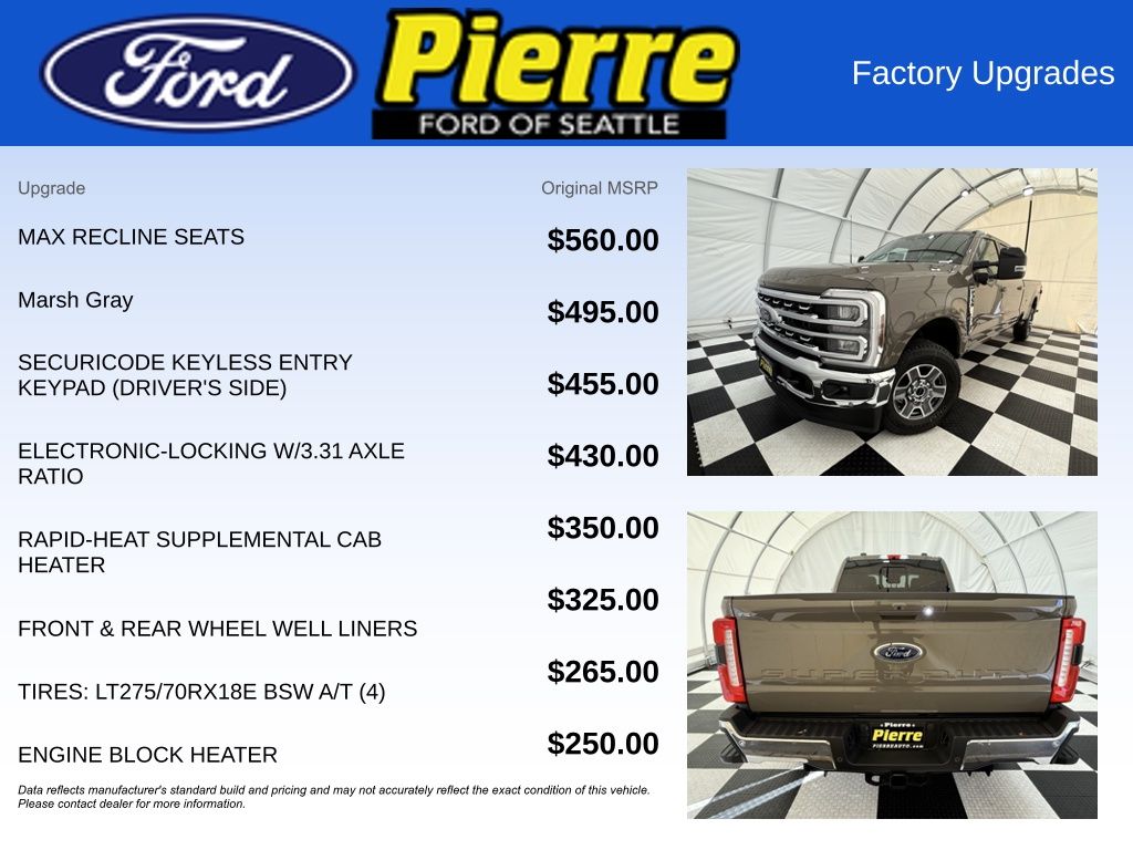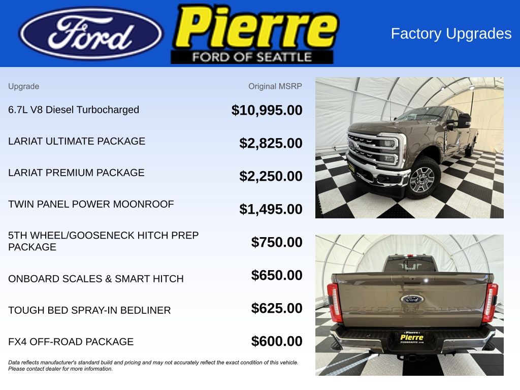 Marsh Gray exterior, Preferred Equipment Package 618A, 6.7-liter Power Stroke V8 diesel engine, 10-speed TorqShift automatic transmission (no charge), LT275/70R18E black sidewall all-terrain tires, 3.31 electronic-locking axle, Front license plate bracket (no charge), FX4 Off-Road Package with skid plates, 12,400-lb GVWR package, Rapid heat supplemental heater, Engine block heater, 50-state emissions (no charge), SiriusXM with 360L (3-month trial), 5th Wheel Hitch Prep Package, Jack, Front and rear wheel well liners, SecuriCode keyless entry keypad, Power twin-panel moonroof, Upfitter switches, 410-amp dual alternator (no charge), Tough Bed spray-in bedliner, Dual battery system (no charge), Max recline driver and passenger seats, On-board scales and Smart Hitch, Connected Package (1-year included with Ford app), Lariat Ultimate Package including power running boards and tailgate step.
