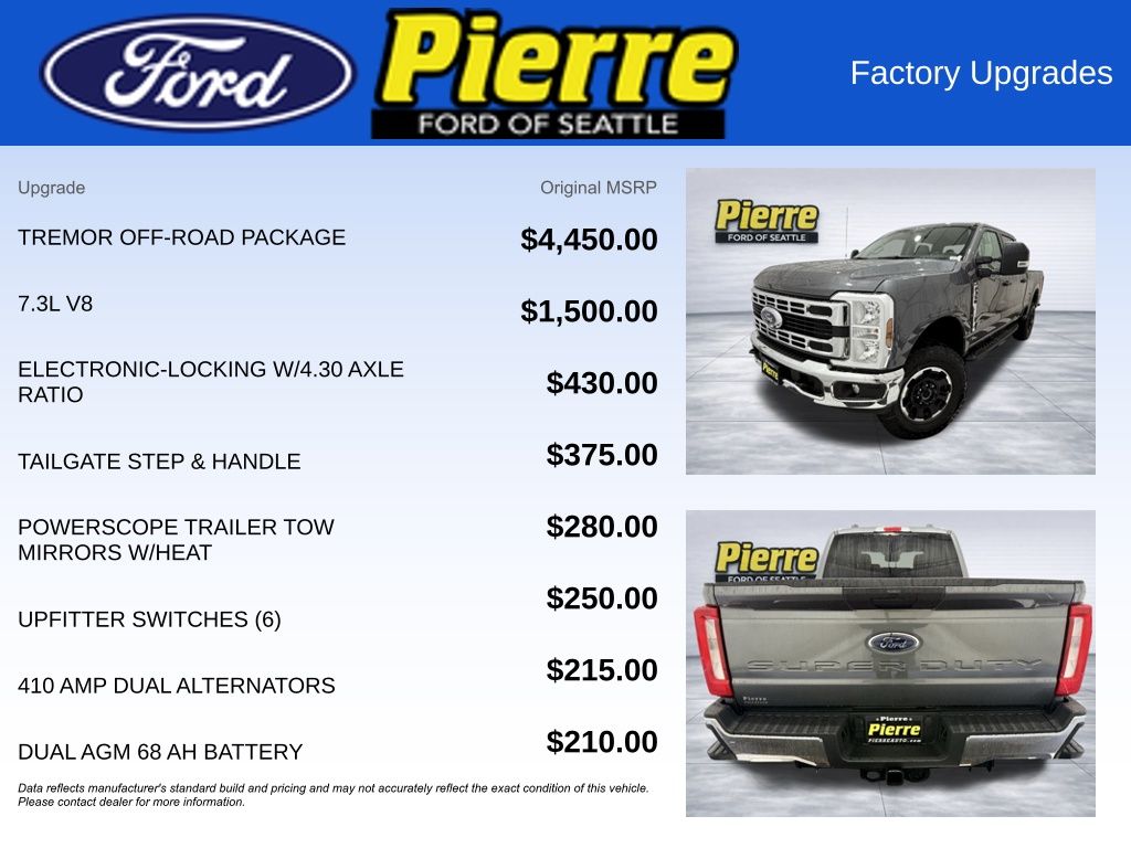 At Bill Pierre Ford, we service not only the Seattle area Ford customer needs, but also the entire state of Washington and beyond. Our customers come from Seattle, Bremerton, Bellevue, Everett, Wenatchee, Arlington, Burlington, Marysville, Lynnwood, Tacoma, and more. 7.3L 8-Cylinder PFI 10-Speed Automatic Gray All vehicles are one of each. A dealer documentary service fee of up to $200 may be added to the sale price or capitalized cost. All financing is subject to credit approval. Prices exclude tax, title, and license and are valid for Washington residents only. All transactions are negotiable including price, trade allowance, interest rate (of which the dealer may retain a portion), term, and documentary service fee. Any agreement is subject to execution of contract documents. Every reasonable effort is made to ensure the accuracy of this data. Please verify any information in question with a dealership sales representative. Expires (date) **FACTORY REBATE(S) Purchaser may not qualify for all rebates. Please contact sales department for details. Price includes: $1000 - Retail Customer Cash. Exp. 03/31/2026