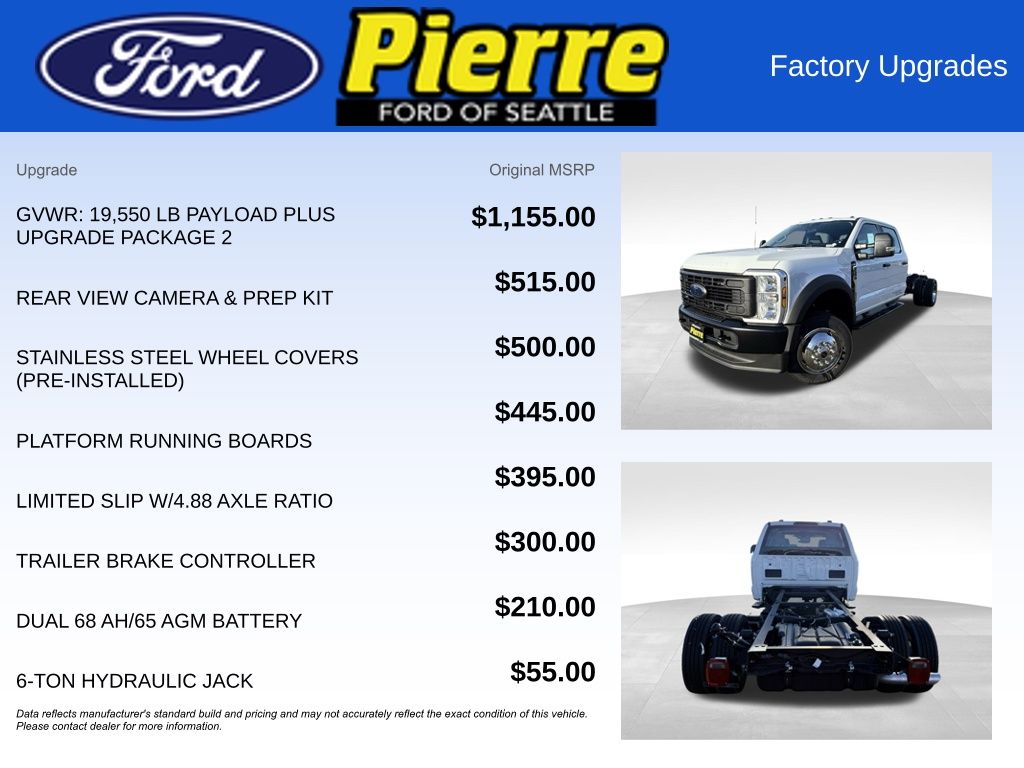 Preferred Equipment Package 660A, 10-Speed Automatic TorqShift Transmission, 4.88 Ratio Limited-Slip Rear Axle, Platform Running Boards, 19,550-Pound Gross Vehicle Weight Rating Package, Trailer Brake Controller, Automatic Emergency Braking Removal, Jack, 40-Gallon Fuel Tank Located Aft of Rear Axle, 350-Amp Alternator, Payload Plus Package Upgrade Level 2, Dual Battery, Rear View Camera and Preparation Kit, Connected Package with 1-Year Included via Ford App, Stainless Steel Wheel Covers.
