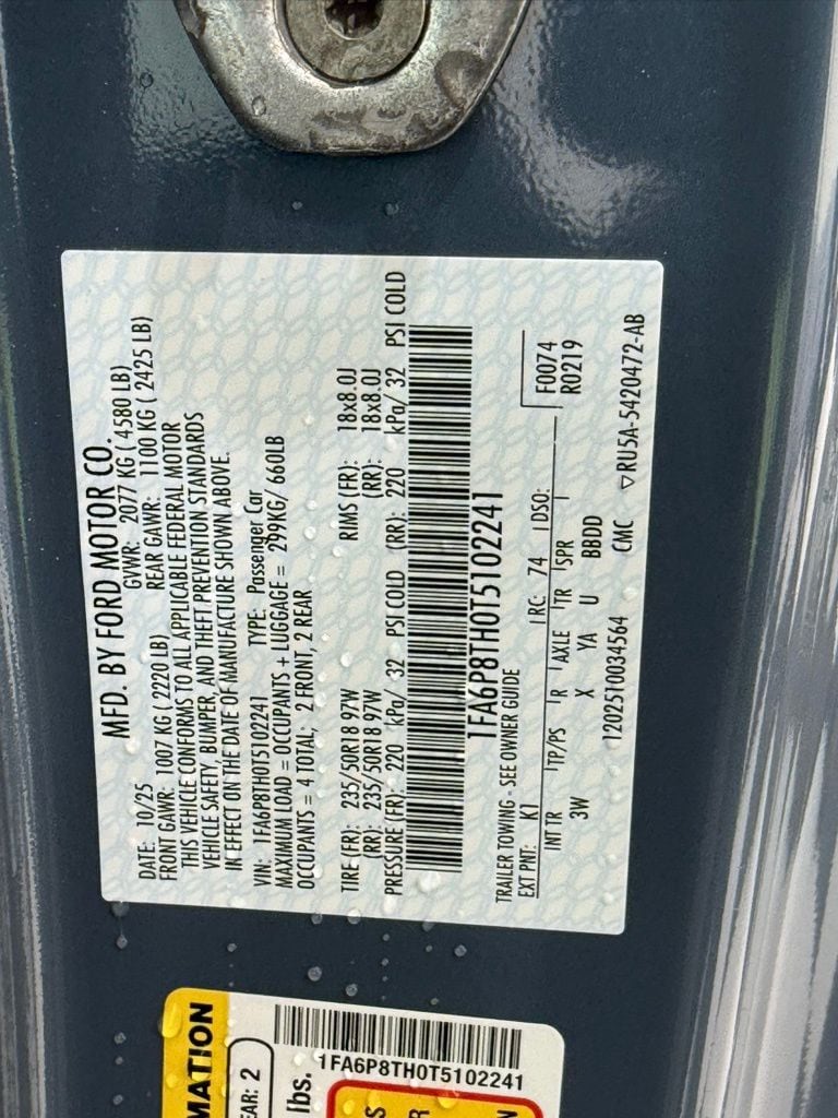 Vapor Blue Metallic; 18-Inch Painted Shadow Silver Cast Aluminum Wheels; 3.15 Ratio Limited Slip Rear Axle; 235/50ZR18 Black Sidewall All-Season Tires; Connected Package with 1-Year Ford App Access; Spoiler Delete; Active Valve Performance Exhaust; Front Floor Mats - Carpeted Black; 4G Embedded Modem; Electronic Power-Assisted Steering; Ford App Integration; Independent Rear Suspension; Intelligent Access with Push-Button Start; Rear Parking Sensors; Rear View Camera; Remote Start via Ford App; Selectable Drive Modes; SiriusXM with 360L (Not Available in Alaska and Hawaii); SYNC 4 Infotainment System; Track Apps.