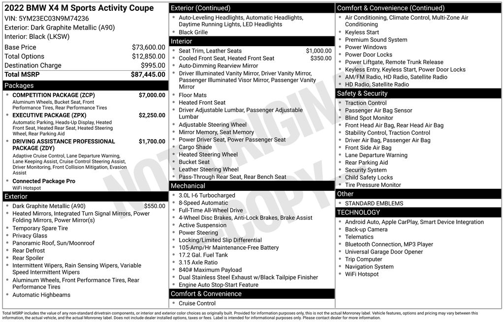 2022 BMW X4 M Dark Graphite AWD 3.0L I6 Turbocharged DOHC 24V LEV3-ULEV125 473hp