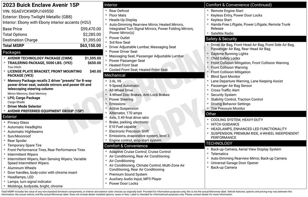 2023 Buick Enclave Avenir AWD ** Ebony Twilight Metallic ** Ebony Leather w/ Ebony Accents ** Avenir Technology Package $1,595 ** Trailering Package $650 ** Hitch Guidance $135 ** 3.6L V6 Engine ** 9-Speed Automatic ** Avenir Exterior Accents ** Premium Ride Suspension ** Heated & Ventilated Front Seats ** Heated Rear Seats ** Power Moonroof ** Navigation ** Bose Premium Audio ** Surround Vision ** Adaptive Cruise Control ** Lane Keep Assist ** Automatic Emergency Braking ** Wireless Apple CarPlay & Android Auto ** 20" Alloy Wheels ** new MSRP was $62,875