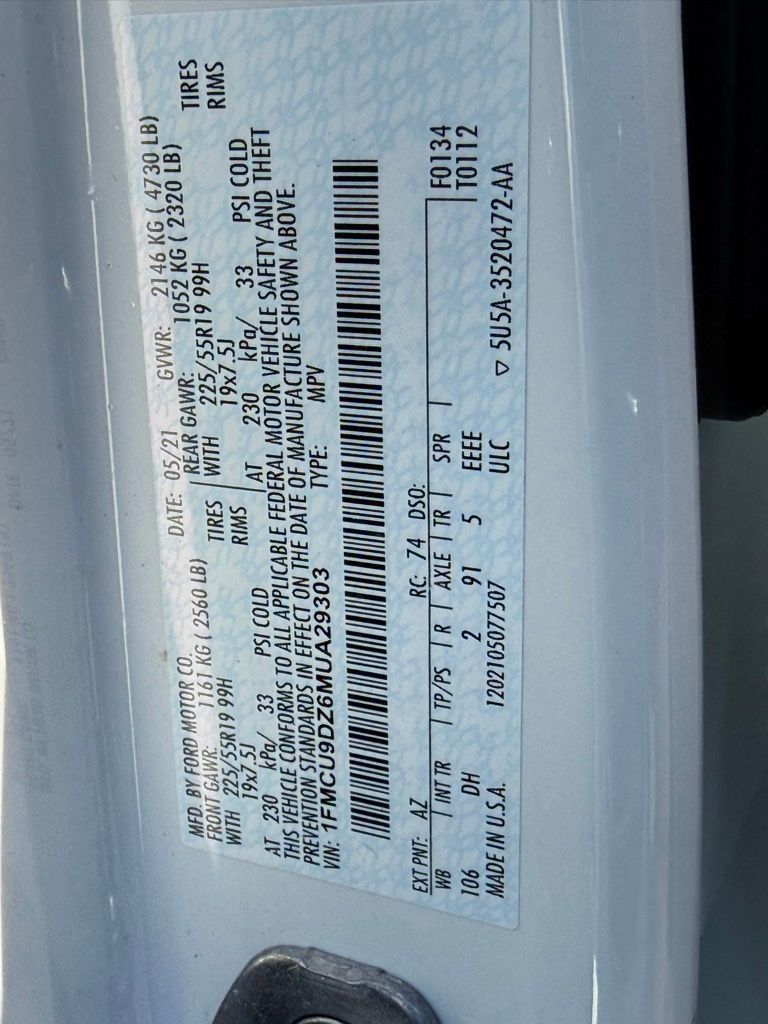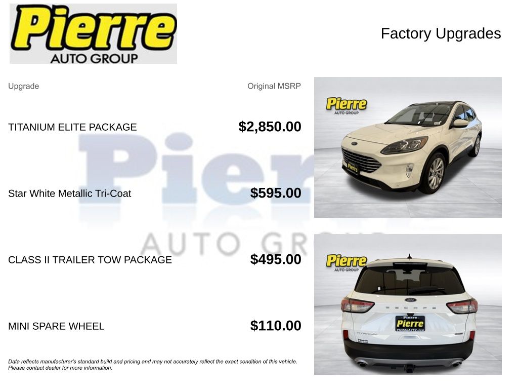 2021 FORD ESCAPE TITANIUM HYBRID AWD ** Titanium Premium Package ($2,850) ** Class II Trailer Tow Package ($495) ** Star White Metallic Tri-Coat ($595) ** Mini Spare Wheel ($110) ** 19" Machined Aluminum Wheels ($0) ** 2.5L Hybrid Engine ** eCVT Transmission ** Panoramic Vista Roof ** B&O Sound System ** new MSRP was $40,095