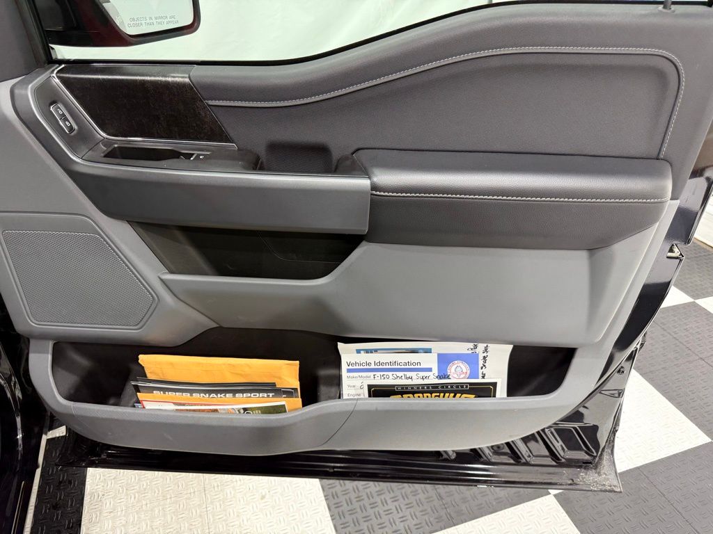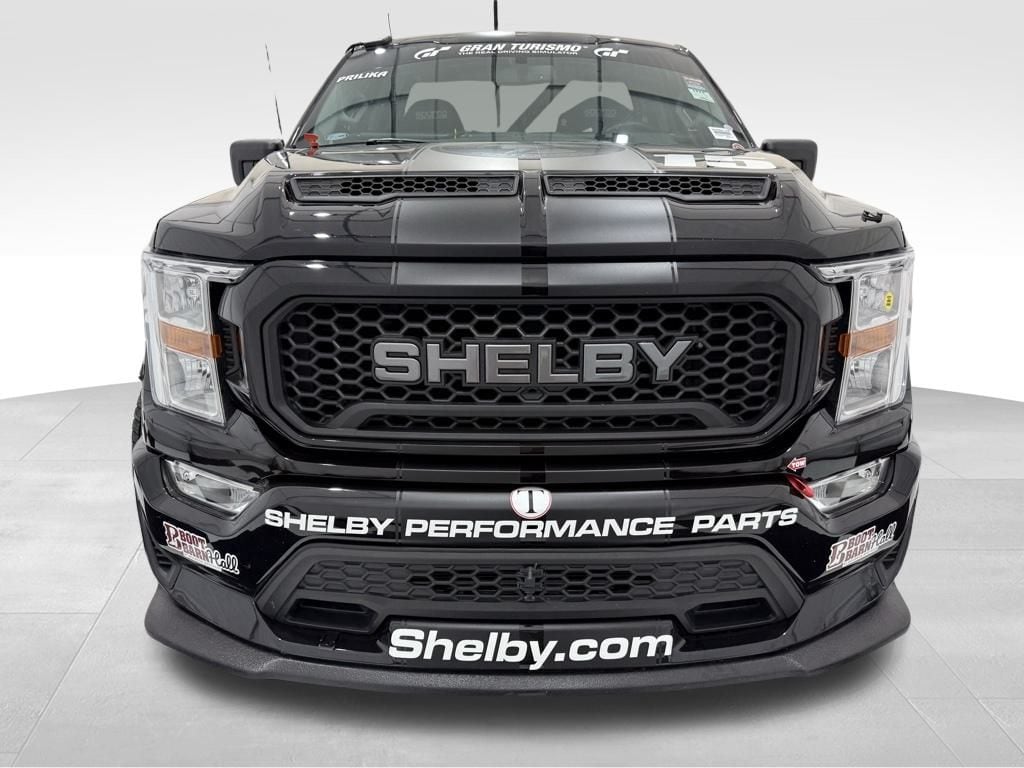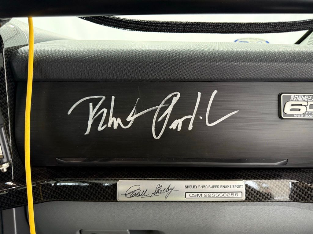2022 Shelby Super Snake F-150: ** Shelby Supercharged 5.0L V8 engine (775 horsepower) ** 10-speed automatic transmission ** 22" Carroll Shelby aluminum wheels ** Shelby-tuned suspension with adjustable coilovers ** Performance exhaust system ** Brembo front brake system ** Ram air hood with Shelby stripes and badging ** Custom front fascia and grille ** Color-matched tonneau cover with spoiler ** Shelby leather interior with embroidered seats ** Carbon fiber interior accents ** Billet racing pedals ** Shelby floor mats ** Serialized dash and engine plate ** Limited production performance truck **