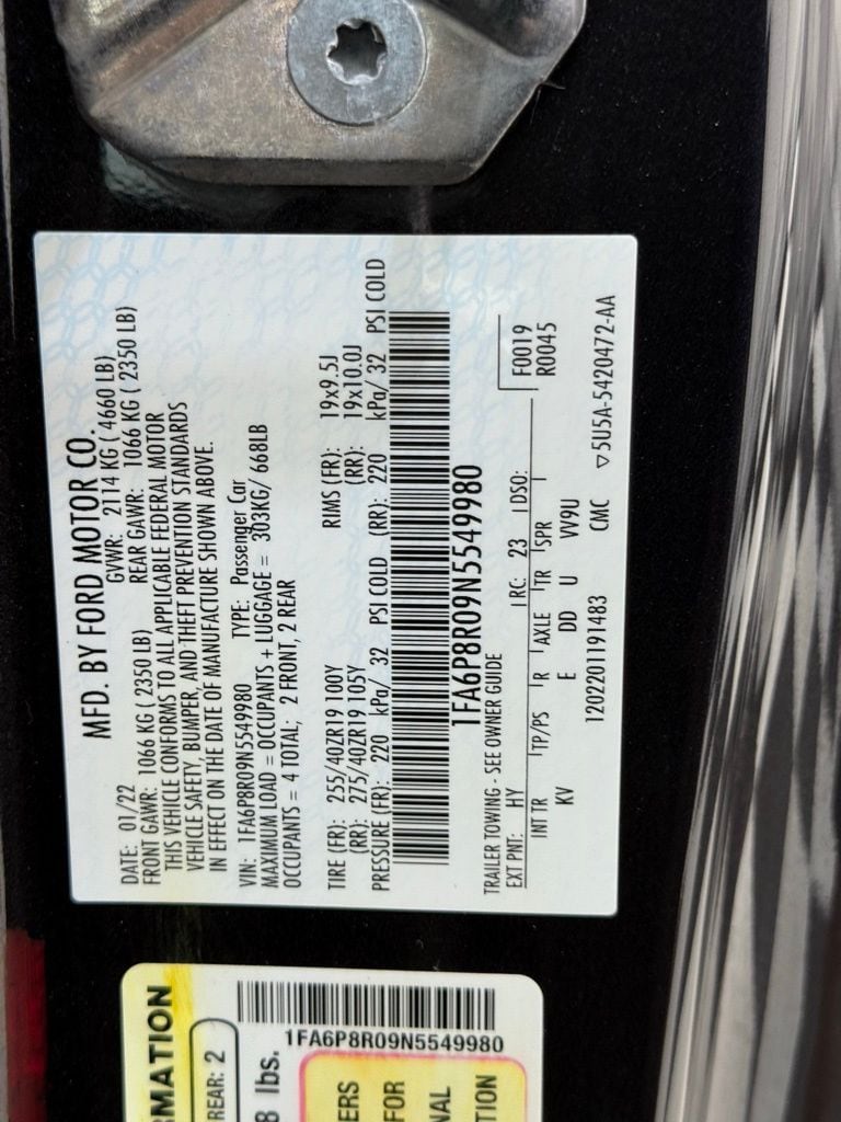 2022 Ford Mustang Mach 1 Coupe Premium: ** Equipment Group 600A (heated and ventilated front seats, navigation, 12" digital cluster, B&O sound system, Ford Co-Pilot360, selectable drive modes, track apps) ** Handling Package $2,250 (adjustable strut top mounts, splitter wickers, rear tire spats) ** 5.0L Ti-VCT V8 engine ** 10-speed automatic transmission ** Dark Matter Gray Metallic exterior ** Ebony leather trim with accent ** MagneRide damping system ** Brembo front brakes ** 19" aluminum wheels ** Dual exhaust with quad tips ** Active valve performance exhaust ** $58,975
