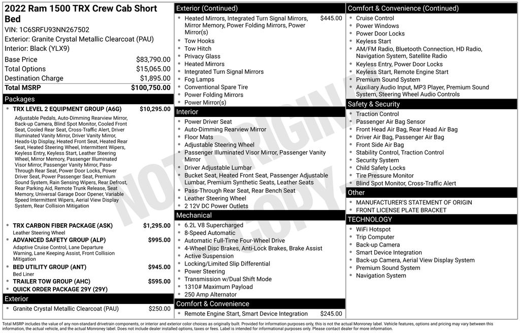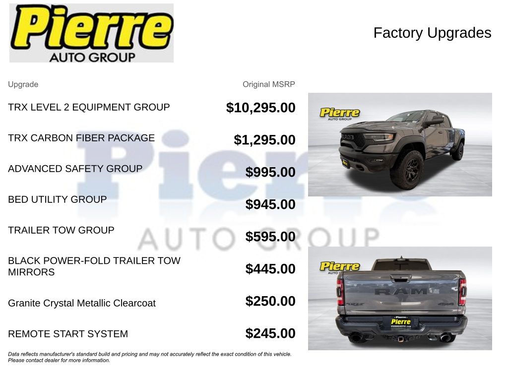 ** TRX Level 2 Equipment Group ($10,295: ventilated front & rear seats, heated steering wheel, power adjustable pedals w/ memory, digital rearview mirror, blind spot & cross path detection, ParkSense front/rear park assist, Harman Kardon 19-speaker premium audio, heads-up display) ** Advanced Safety Group ($995: adaptive cruise control w/ stop & go, lane keep assist) ** Trailer Tow Group ($395) ** Carbon Fiber Interior Package ($1,295) ** Bed Utility Group ($845) ** Lower Two-Tone Paint ($250) ** Red Seat Belts ($95) ** 18" Beadlock-Capable Wheels ($0) ** Bilstein Black Hawk e2 Adaptive Performance Shocks ($0) ** 6.2L Supercharged HEMI V8 ($0) ** 8-Speed Automatic Transmission ($0) ** 4x4 ** 12 MPG combined / 10 city / 14 highway ** new MSRP was $94,195